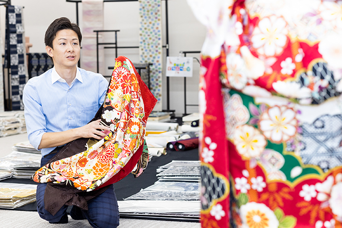 きものの魅力を知っていただくためには、やはり直接きものを手に取っていただき、袖を通していただくのが一番だと考えています。晴れの日などの、特別な日だけでなく、普段の生活のなかできものを楽しんでいただきたい。全国各地に出張する営業社員を中心とし、きものの良さを知っていただく機会を多く提供しております。